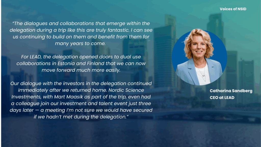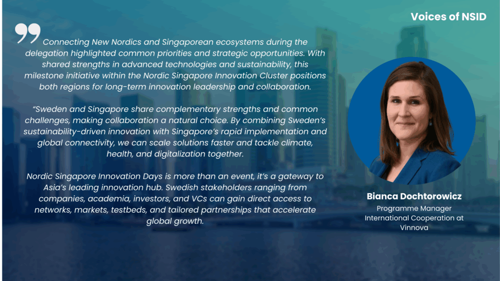 🟢 Nordic Singapore Innovation Days 2025 – The largest Nordic delegation ever to Singapore, bringing together over 55 startups, investors, and ecosystem actors.🟢 Partnerships established with Enterprise Singapore, SGInnovate, EDB, Business Finland, Startup Estonia and the Nordic Innovation House, among others.🟢 More than 190 business and investor meetings facilitated partly through Ignite Sweden’s matchmaking process.🟢 The Inauguration at SWITCH Singapore featured Nordic Ambassadors, government partners, and deeptech leaders from both regions.
